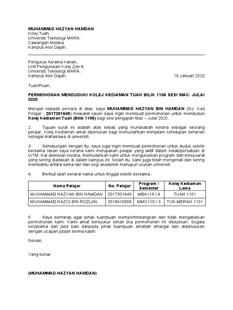 Doc surat pertukaran asrama azrie amir academia edu. Puan anisah hj sawit warden kolej kediaman institut pendidikan. Surat Permohonan Pdf Contoh Surat Rayuan Pdf Contoh Surat Permohonan Asrama Contoh Surat Rayuan Kolej Kediaman Pdf Rayuan Kolej Pdf Kediaman Kolej Surat wallpaper.